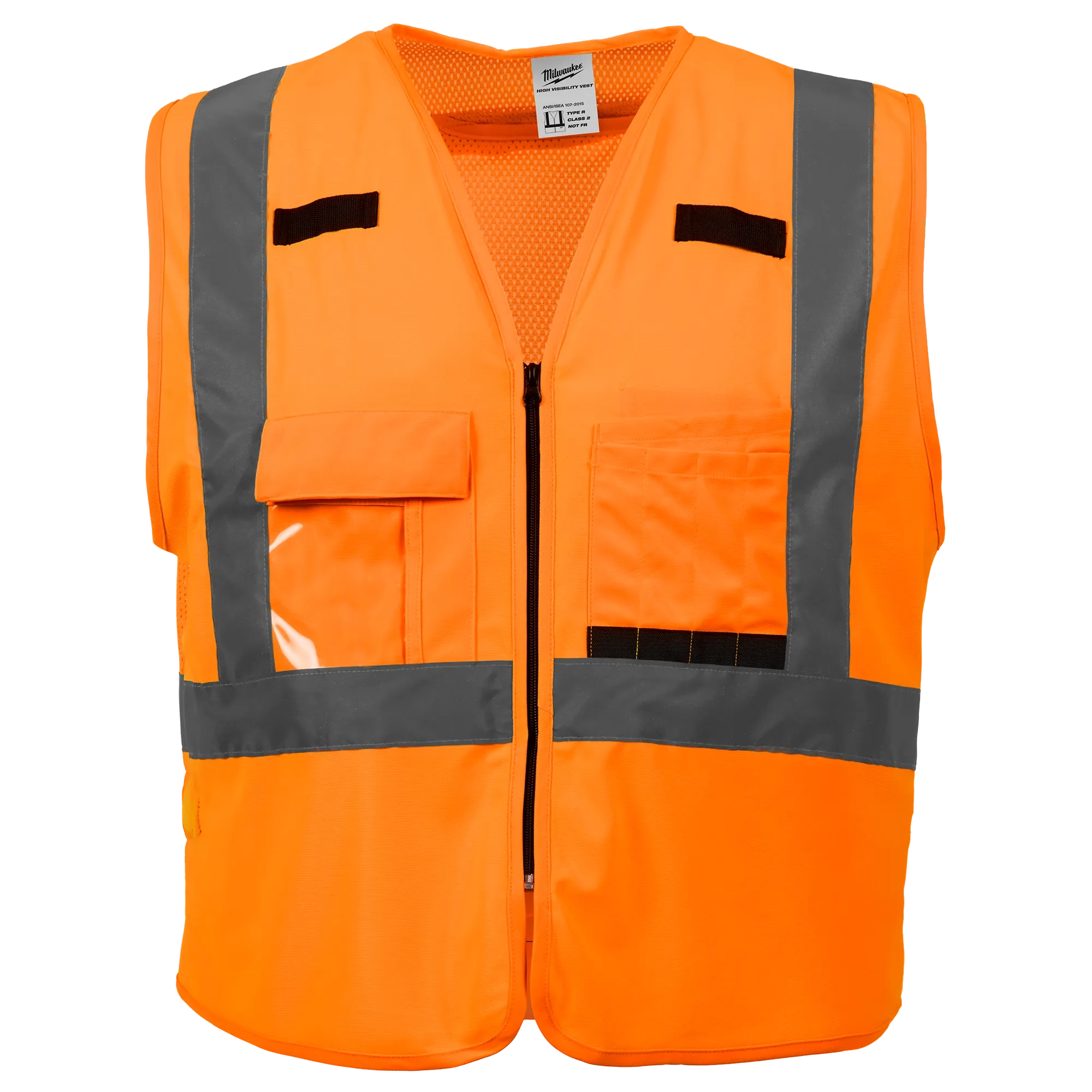 The Milwaukee 48-73-5033 Class 2 High Visibility Orange Safety Vest is designed to help professionals carry more while staying visible and secure on the jobsite. Built to ANSI Type R Class 2 standards, this high-visibility safety vest features a durable polyester construction and a functional 10-pocket layout, including a clear ID holder and an internal pocket for added storage. A reinforced pass-through slit allows compatibility with fall protection gear, while the secure zipper closure delivers reliable jobsite safety. Ideal for environments with traffic under 50 mph or heavy machinery, this vest is well suited for construction, road work, traffic control, utility crews, and survey work. Logo customization options are available.